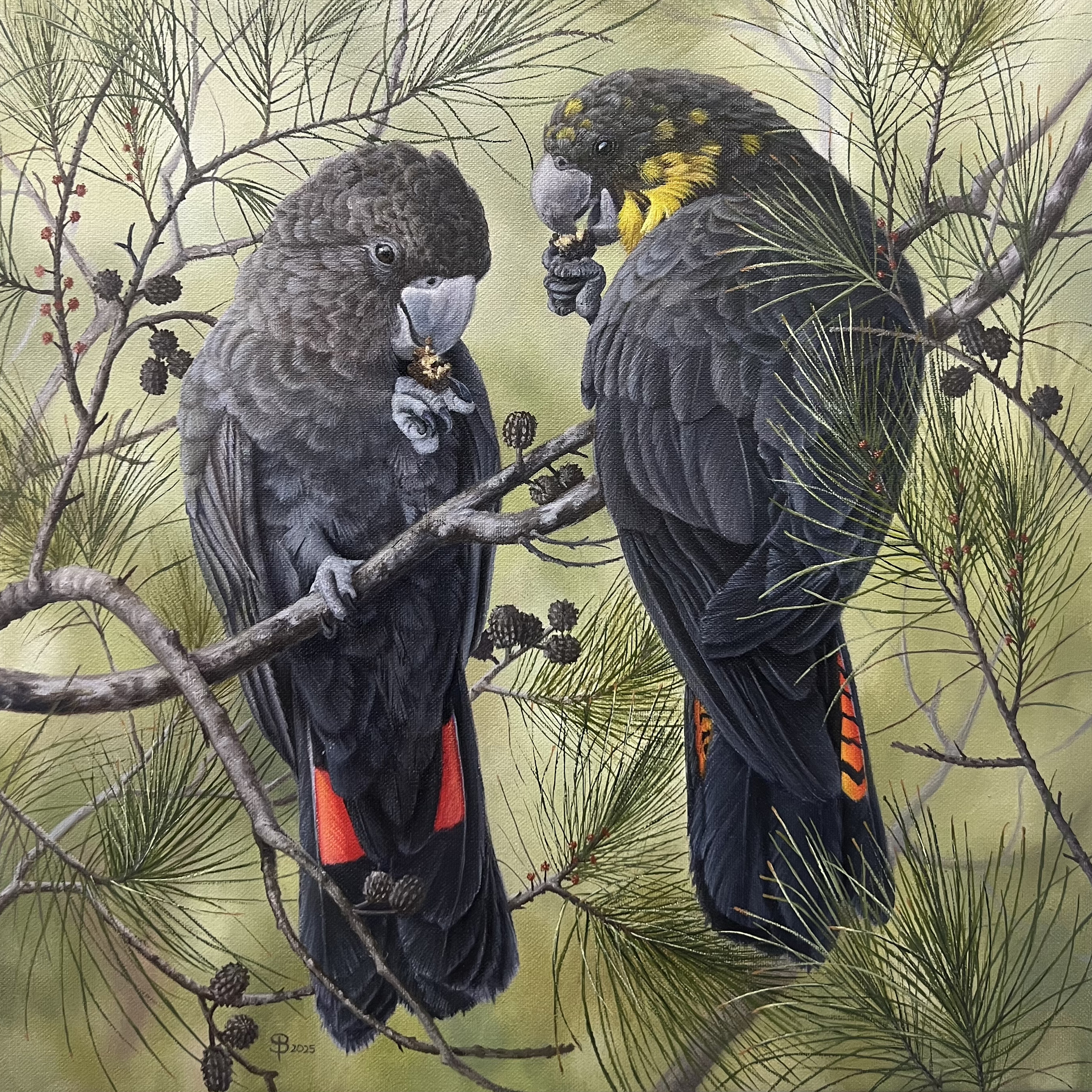 Opalesque (Red-rumped Parrots) oil on linen 305 x 605 mm
